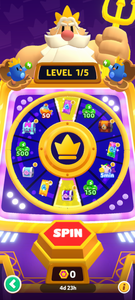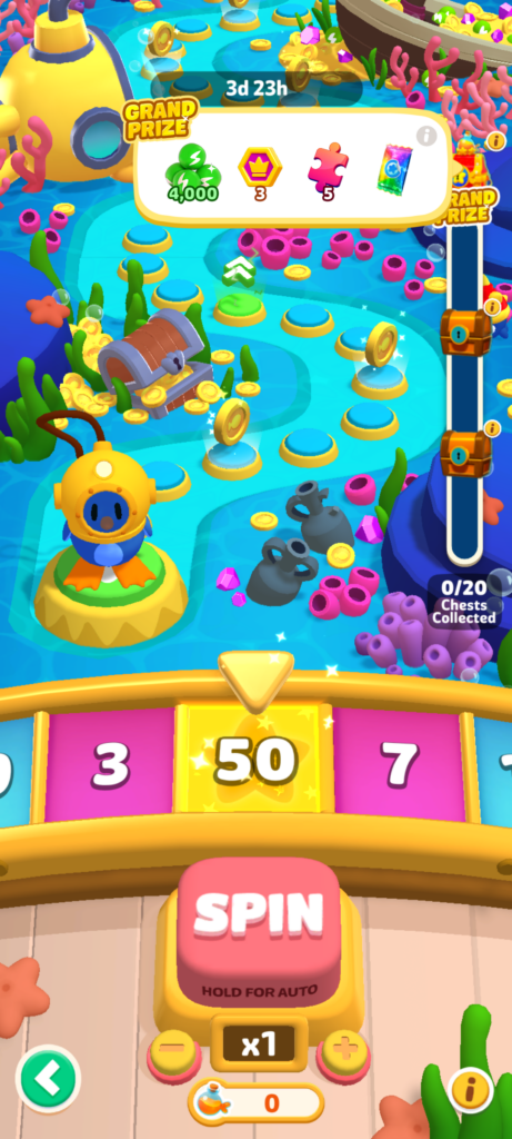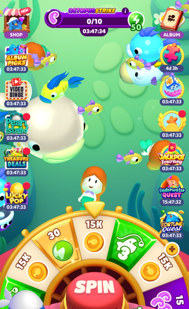 エナジーを消費してルーレット(スピン)を回し、魚を釣ってコインを集めるゲームです。