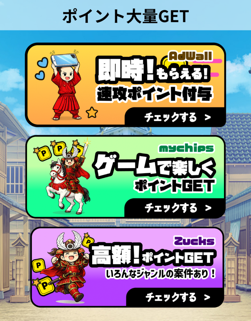 また、ゲーム内に表示される「大量ポイントGET」バナーを利用することで、外部サービスの登録などから一気にポイントを獲得することも可能です。