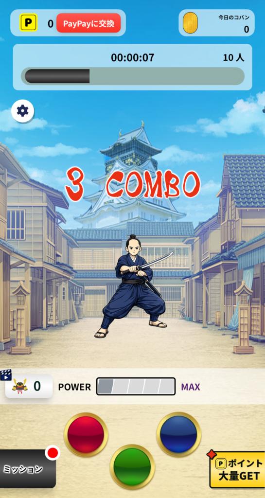 忍者の色に対応したボタンを押すことで小判を獲得でき、ミスをせずに続けることで効率よく小判を稼ぐことができます。