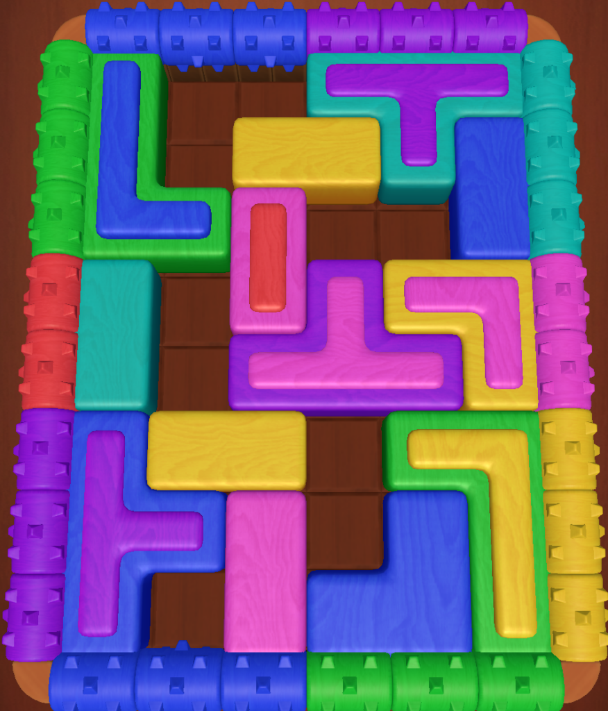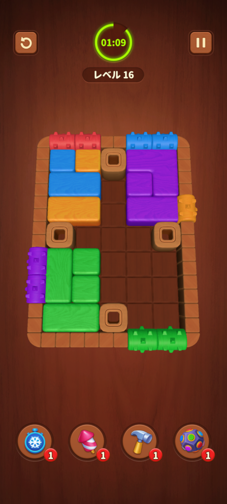 「Wood Block Jam」は、マス目の中でブロックをスライドさせて、同じ色のクラッシャー(トゲの付いたローラー)まで移動させて消していくパズルゲームです。