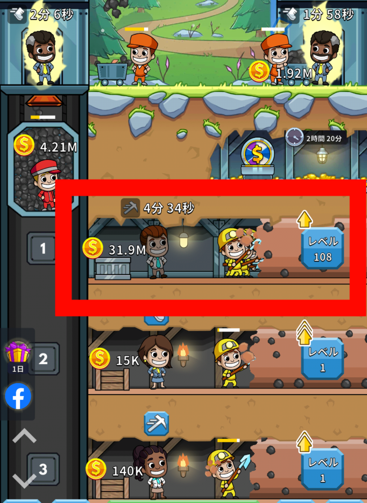 よって1番目の採掘場を集中的にレベルアップすると収益を増やしやすくなります。