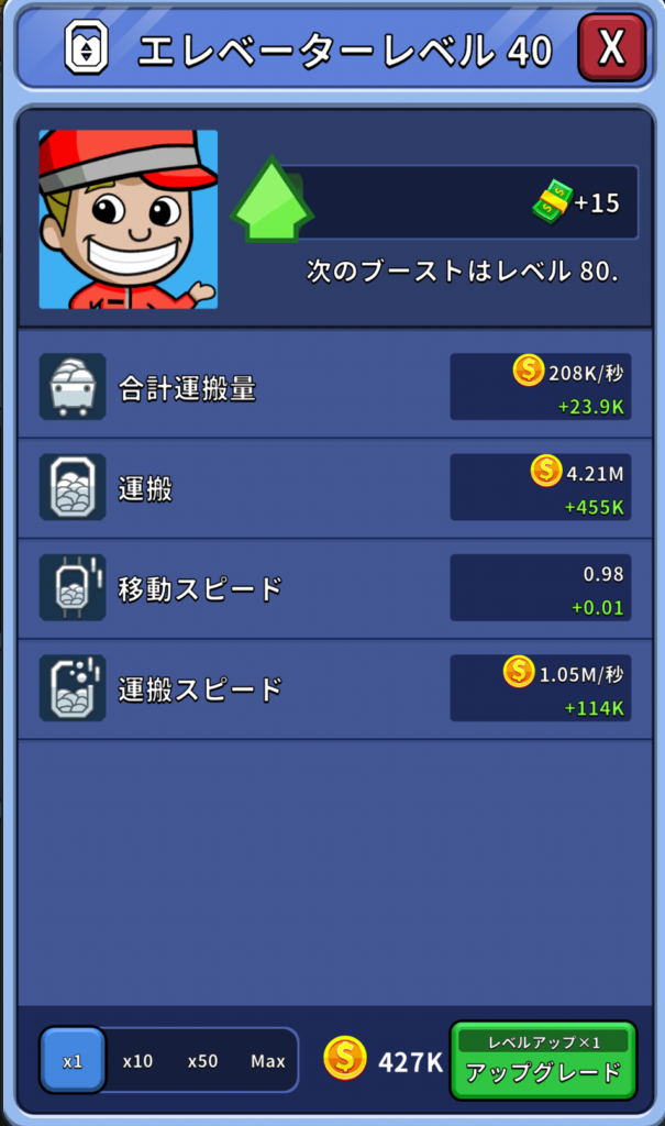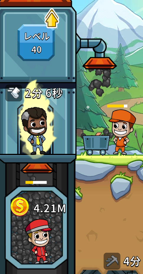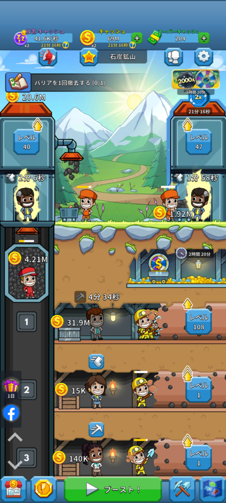 施設を強化することで採掘量や運搬速度が上がり、より多くのコインを稼げるようになります。