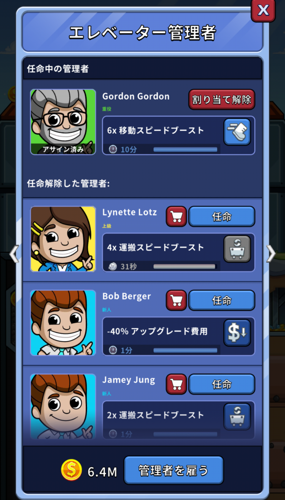 また、施設のレベルアップを行う際には「アップグレード費用を下げる能力」を持つマネージャーを使うとコストを節約できます。