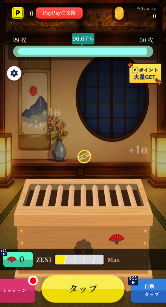 また、ゲーム内には「扇子」というアイテムがあり、使用することで1回のクリア時に獲得できる小判の枚数を増やすことが可能です。さらに「大量ポイントGET」のバナーから外部サービスの案件を利用することで、一気にポイントを獲得する方法もあります。